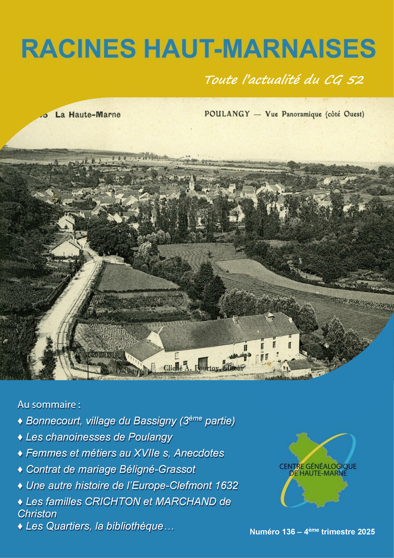 Racines n° 136 : Vie de l'association - Courrier des lecteurs - Bonnecourt (3ème partie) - Enquête sur une carte postale - Les chanoinesses de Poulangy dans la tourmente de la Révolution - Quartiers de Anne de Beurville et Sophie de Richebourg - Femmes et métiers au XVIIe siècle - Anecdotes - Contrat de mariage de François Beligné et Catherine Grassot - Une autre histoire de l'Europe : Clefmont 1632 - Les familles Crichton et Marchand de Christon - Quartiers de Marie-Annick Desnouveaux (fin) - Nouvelles revues - Notes de lecture.